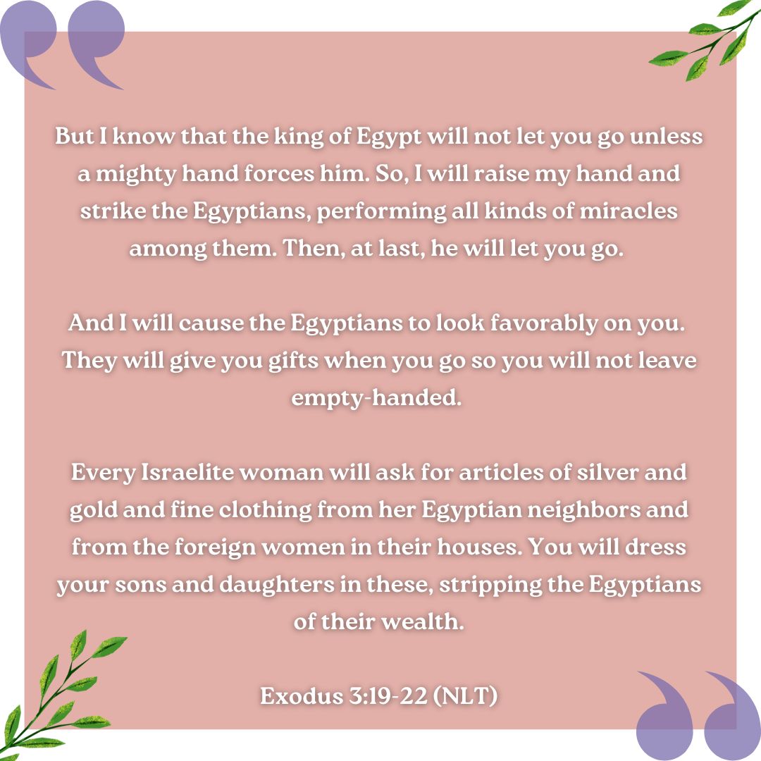 “But I know that the king of Egypt will not let you go unless a mighty hand forces him. So, I will raise my hand and strike the Egyptians, performing all kinds of miracles among them. Then, at last, he will let you go. And I will cause the Egyptians to look favorably on you. They will give you gifts when you go so you will not leave empty-handed. Every Israelite woman will ask for articles of silver and gold and fine clothing from her Egyptian neighbors and from the foreign women in their houses. You will dress your sons and daughters in these, stripping the Egyptians of their wealth.”
