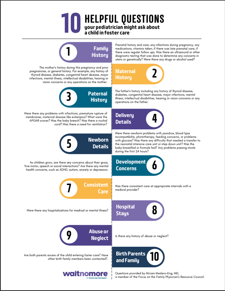 Dr. Miriam Medero-Eng, a pediatrician on the Focus on the Family Physician’s Resource Council, has provided a list of ten helpful questions that your pediatrician might ask about a child in foster care. You can click here or on the image below to download Dr. Medero-Eng’s helpful list.