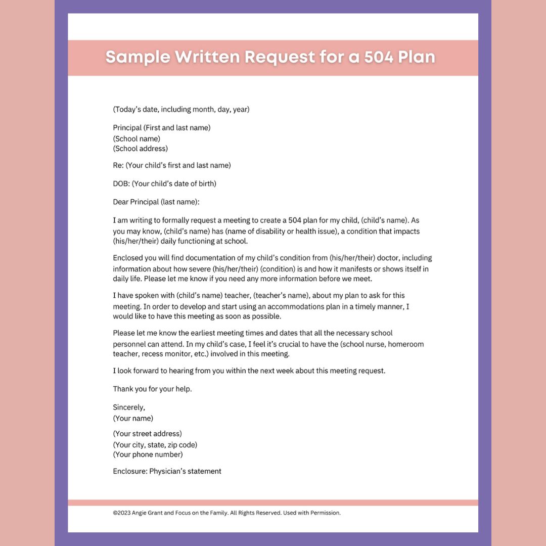 Accommodations help children with specific needs succeed and grow. Your school provides a 504 plan at no cost. Unlike an IEP, a 504 does not require a complete evaluation, and it can accommodate a child through the college years. Begin by documenting or obtaining documentation of your child’s needs, diagnosis, or previous report cards. Next, research who your county’s 504 coordinator is. You can usually find this information on your county’s school district site. Your school principal is also a great resource if you need help finding the coordinator.